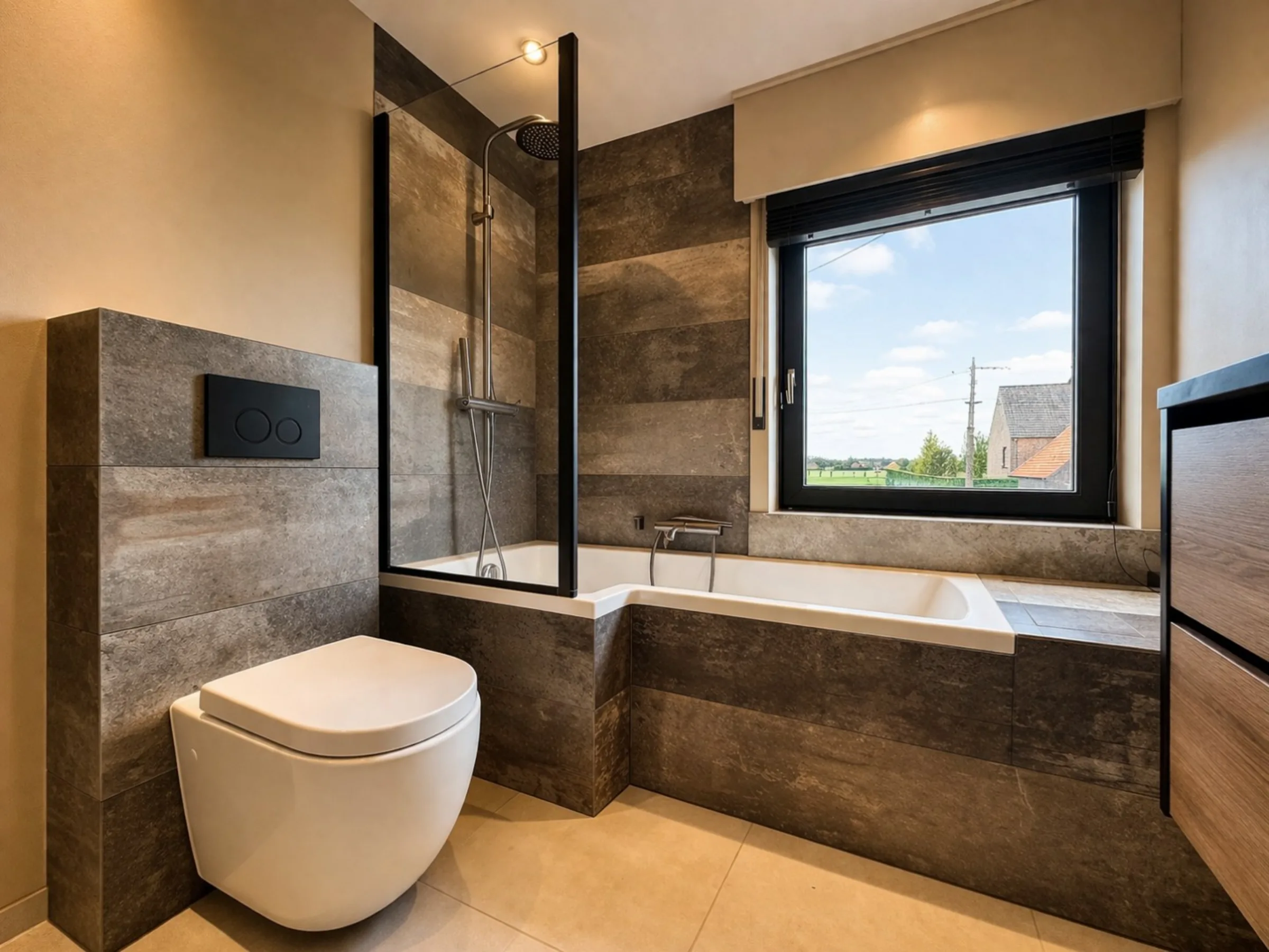 Via de oprit bereik je de garage en inkomhal met gastentoilet. De lichtrijke leefruimte met open keuken vormt het hart van de woning. De luxekeuken is uitgerust met een Lacanche fornuis (kookplaat, grill, oven, bordenwarmers) en biedt samen met de leefruimte een mooi zicht op de tuin. Airco zorgt voor comfort, zomer én winter. (zonnepanelen aanwezig)