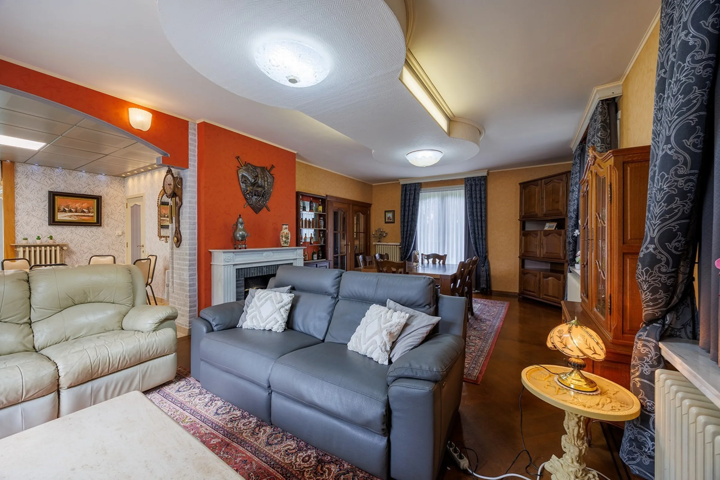 Je komt binnen in een ruime inkomhal met rechts een groot bureau. Links leiden dubbele deuren naar de lichtrijke leefruimte (zit- en eetplaats) met parket en houthaard. Aansluitend: een tweede eetruimte en een goed uitgeruste keuken met twee bergingen. De veranda kijkt uit op de tuin en laat je elk seizoen genieten. Op het gelijkvloers zijn er ook nog een douchekamer met toilet en een kelder.
